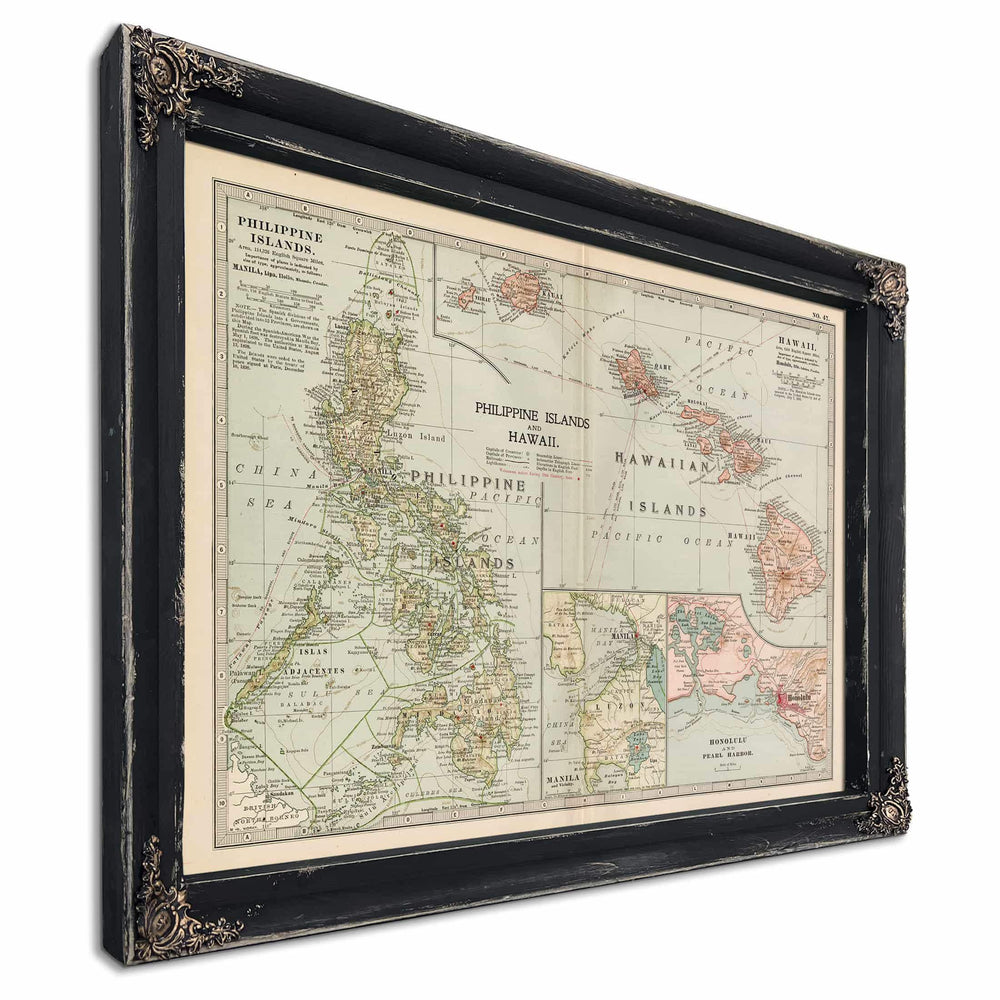 Framed Philippines Islands and Hawaii Vintage Map - Ornate Embellishment Frame with Print