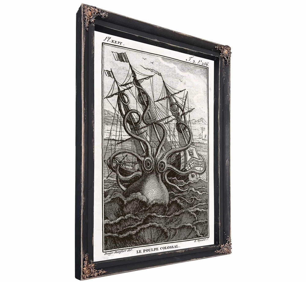 Octopus attacks a ship by Alphonse Marie de Neuville Framed Art - Vintage Artwork Print