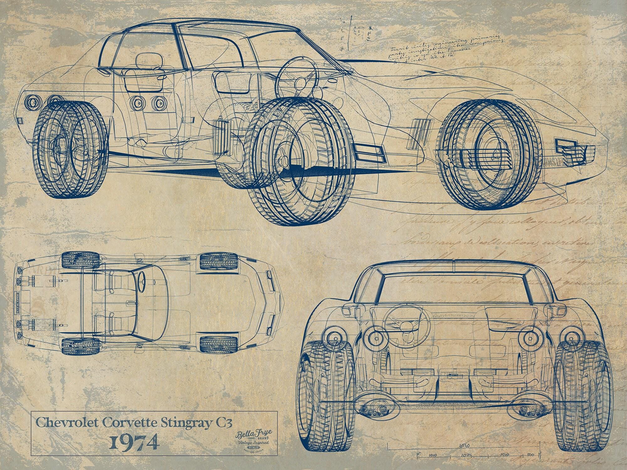 • Bella Frye 1974 Corvette Stingray C3 Blueprint Art: Vintage Car Model Print