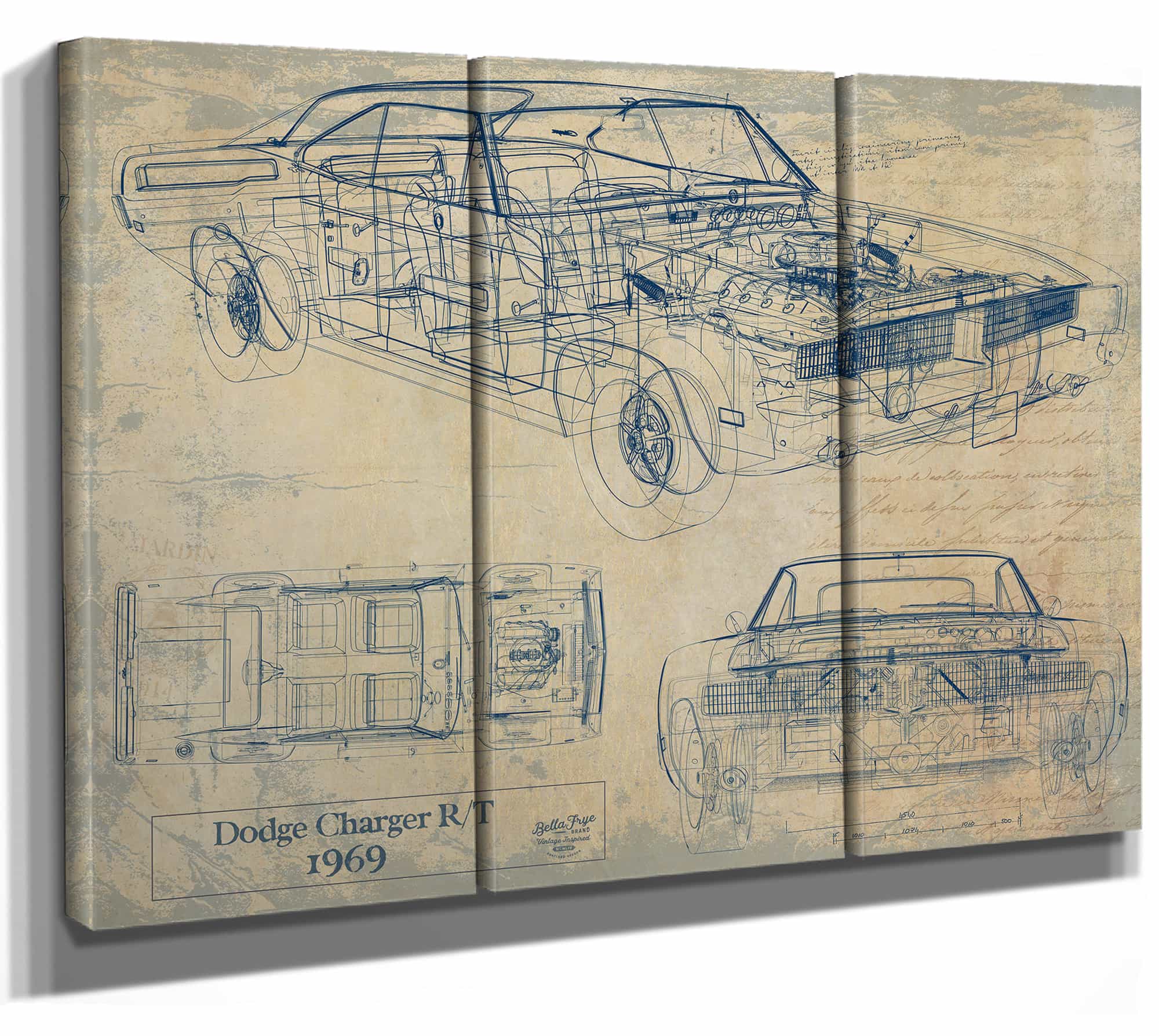 • Bella Frye Home & Garden > Decor > Artwork 36" x 24" / 3 Panel Canvas Wrap / Blue Dodge Charger RT 1969 Original Artwork