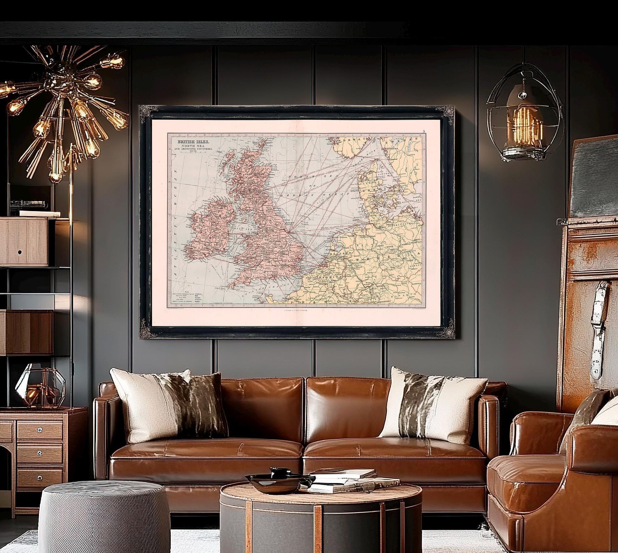 Framed British Isles, North Sea, and adjoining countries Vintage Map - Ornate Embellishment Frame with Print