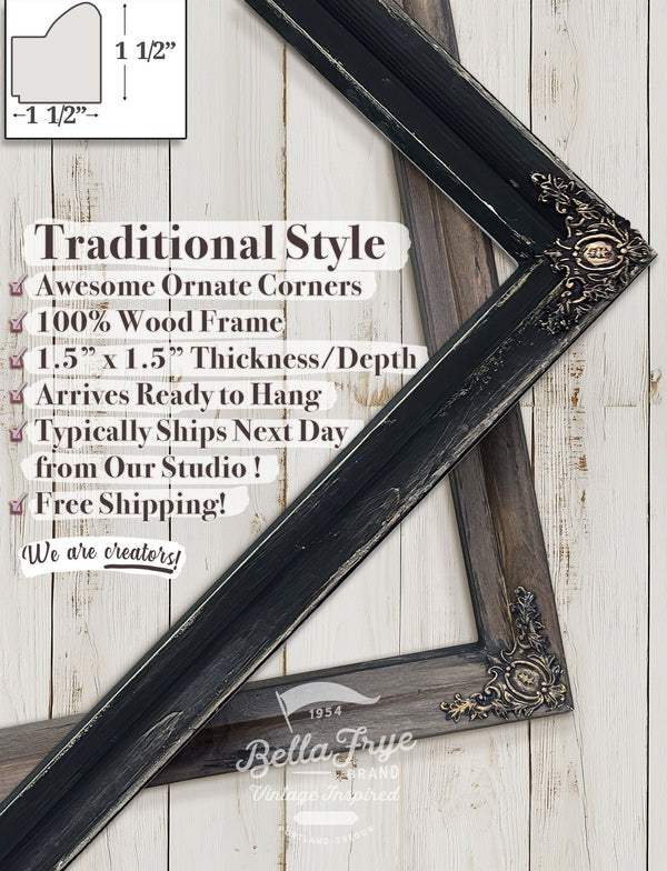 Elevate your artwork with our premium 100% wood frames, featuring elegant ornate corner embellishments for a timeless touch. Available in three stunning finishes: classic brown for a traditional look, Classic Gold , and black with a distressed style for a vintage feel. These frames are perfect for adding sophistication and charm to any room, making your art truly stand out.