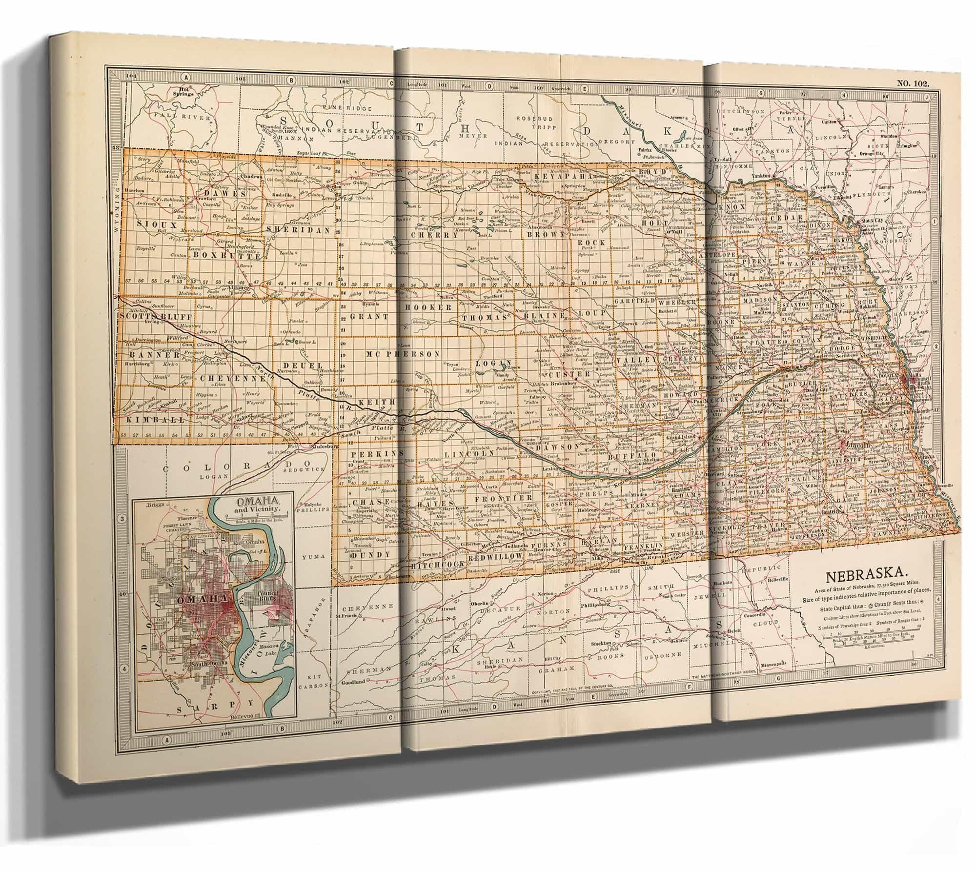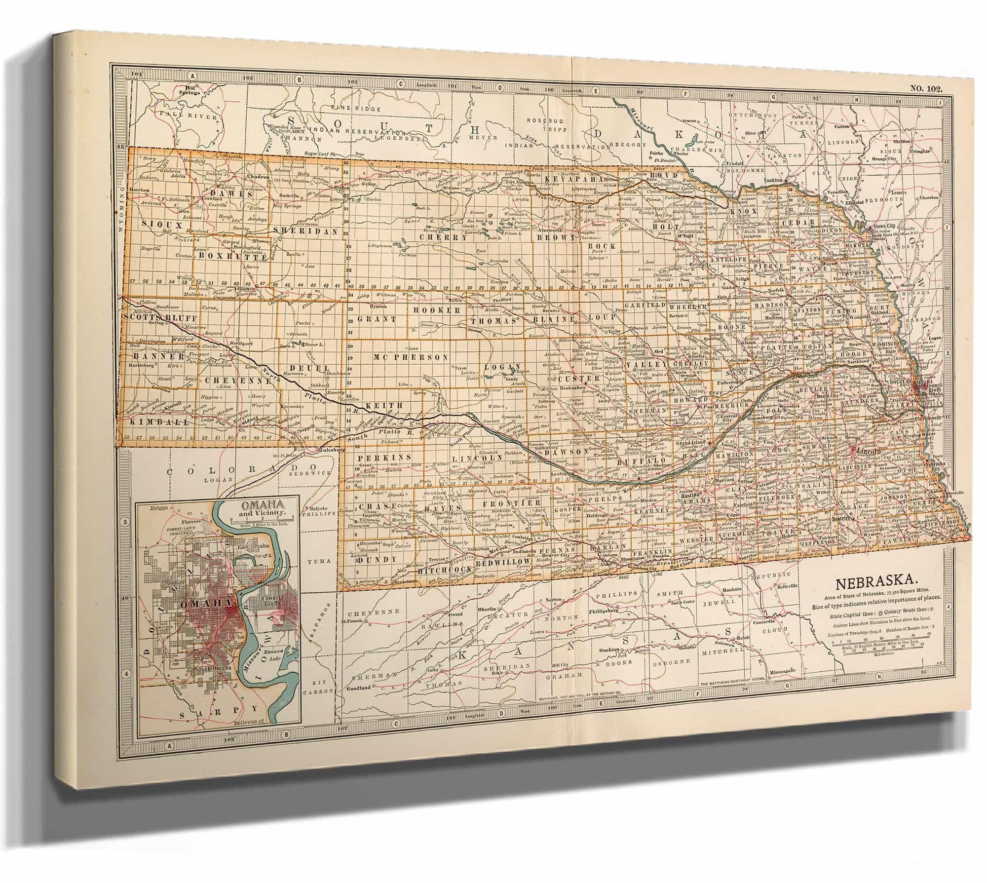 Framed Nebraska Vintage Map - Ornate Embellishment Frame with Print