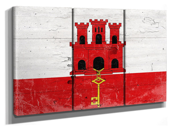 • Bella Frye Home & Garden > Decor > Artwork 60" x 40" / 3 Panel Canvas Wrap Gibraltar Flag Wall Art - Vintage Gibraltar Flag Sign Weathered Wood Style on Canvas