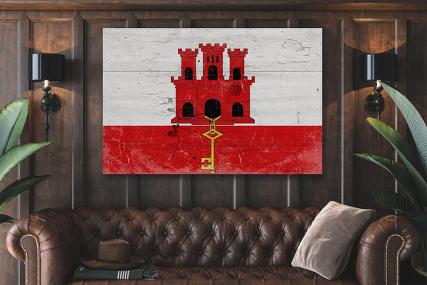 • Bella Frye Home & Garden > Decor > Artwork 24" x 18" / Fine Art Paper Gibraltar Flag Wall Art - Vintage Gibraltar Flag Sign Weathered Wood Style on Canvas