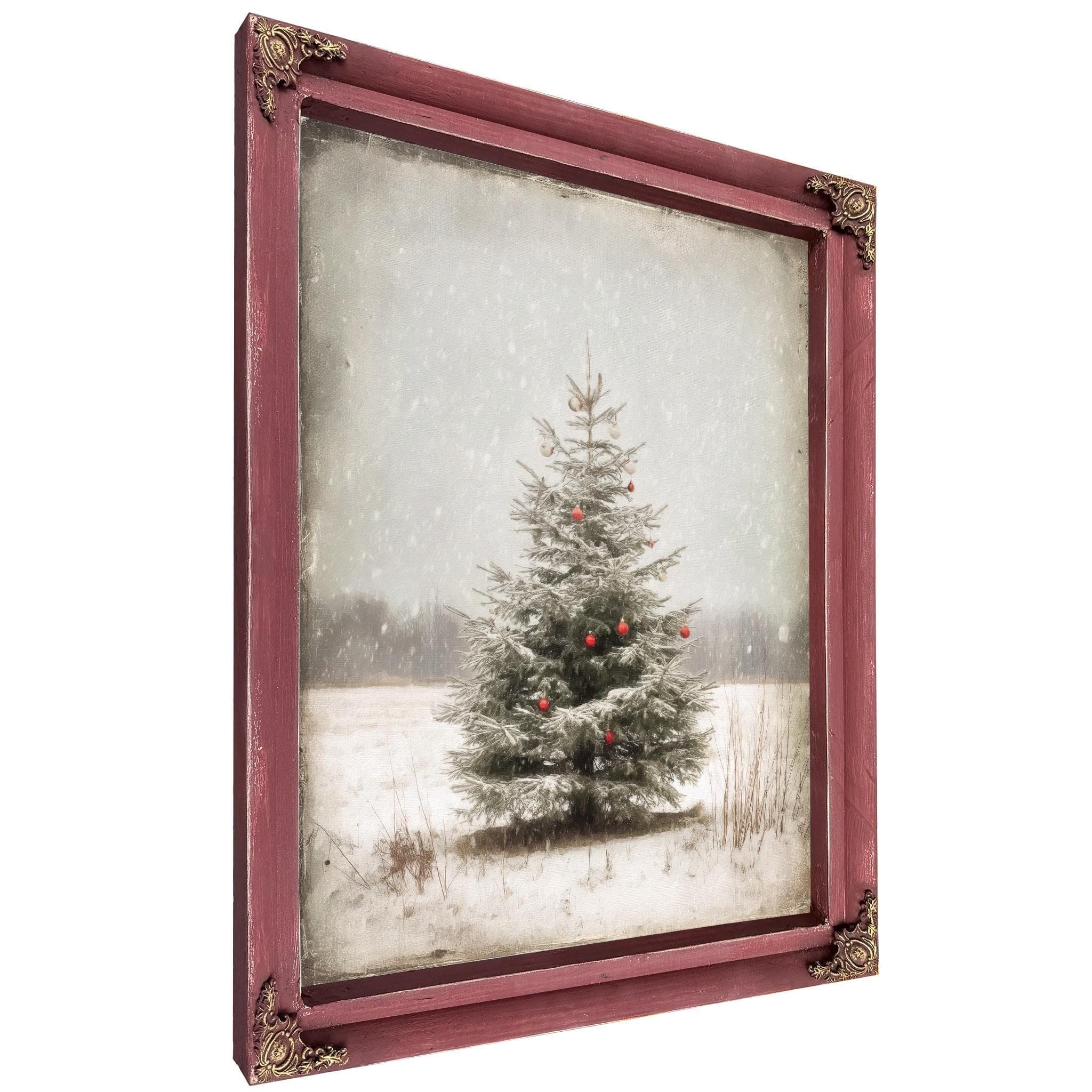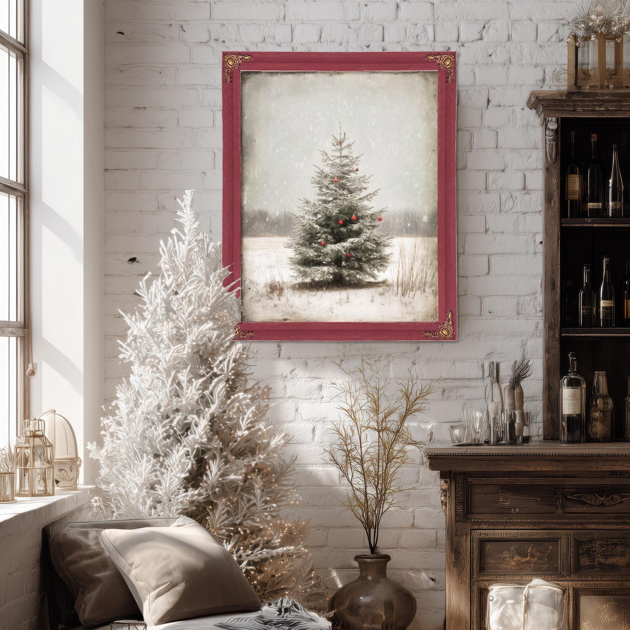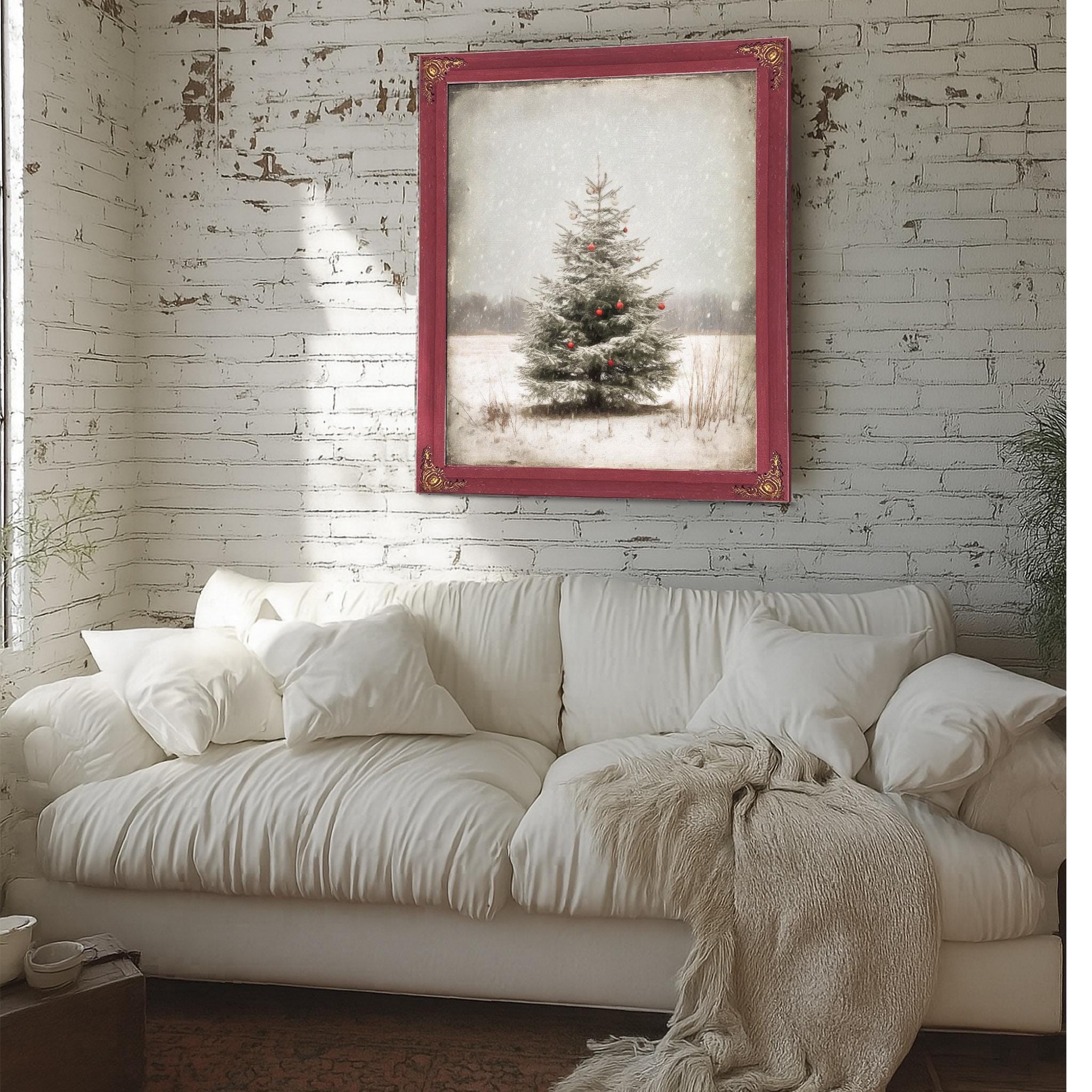 • Lone Christmas Tree in Snow – Vintage Winter Wall Art with Red Ornaments – Stretched Canvas or Ornate Frame, Farmhouse Christmas Décor