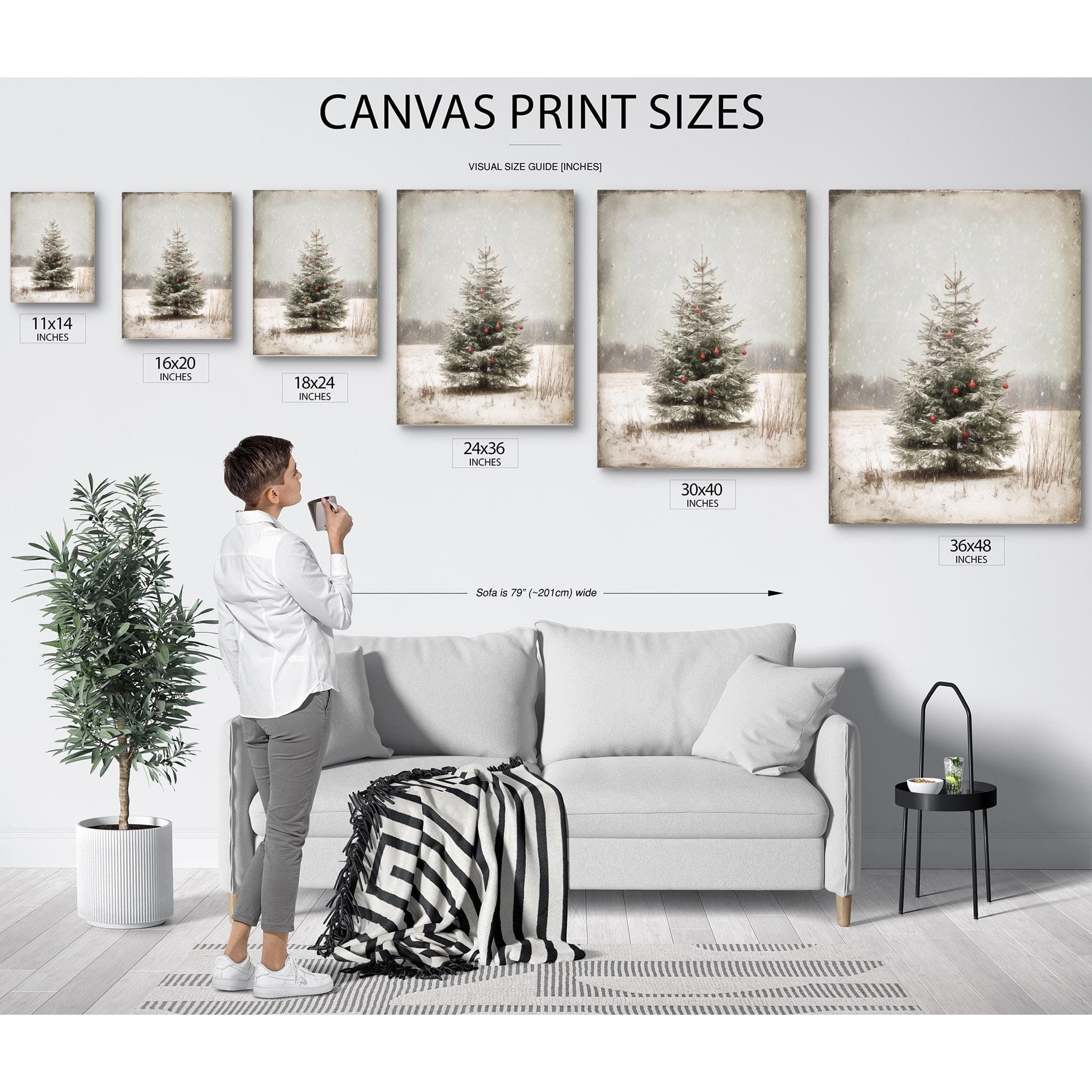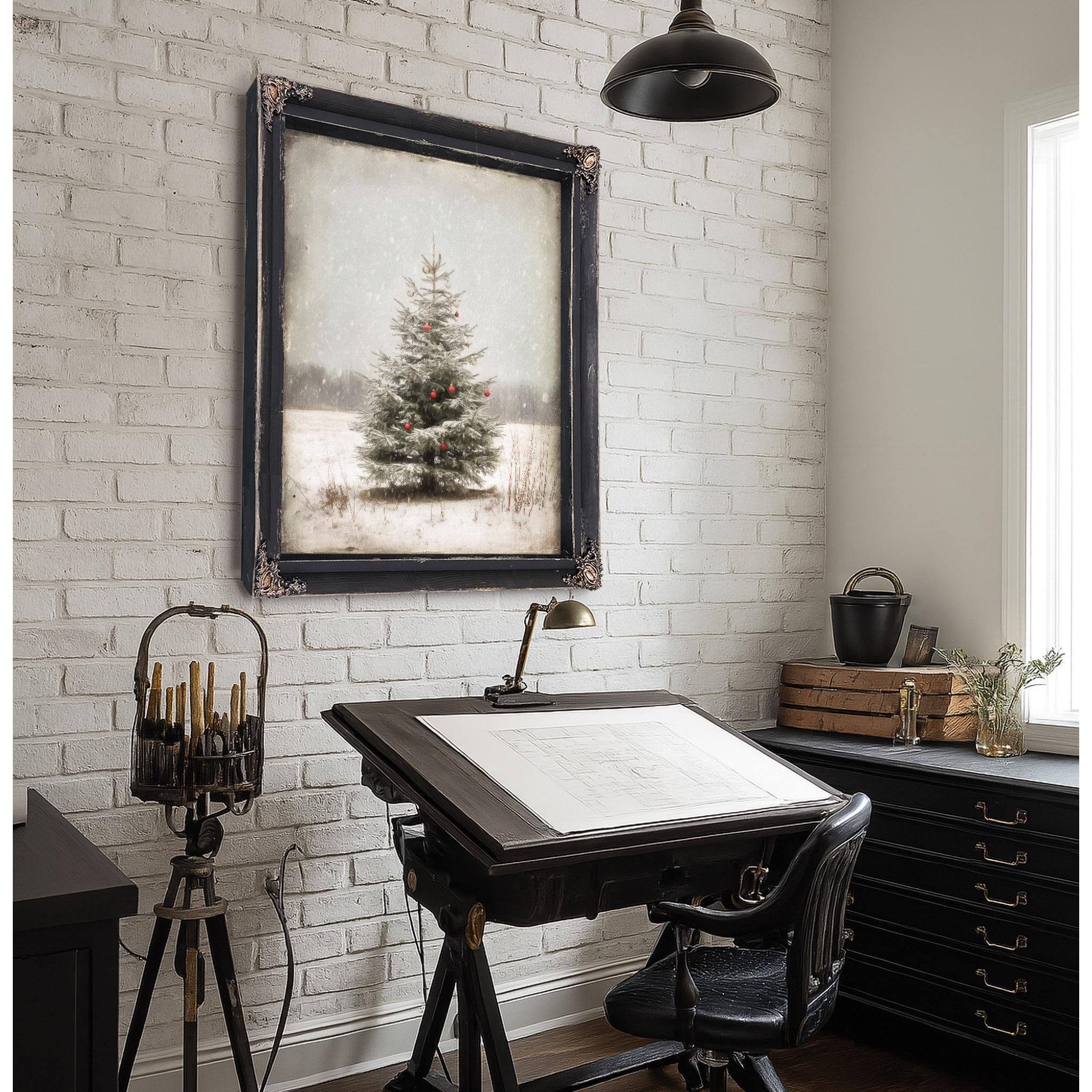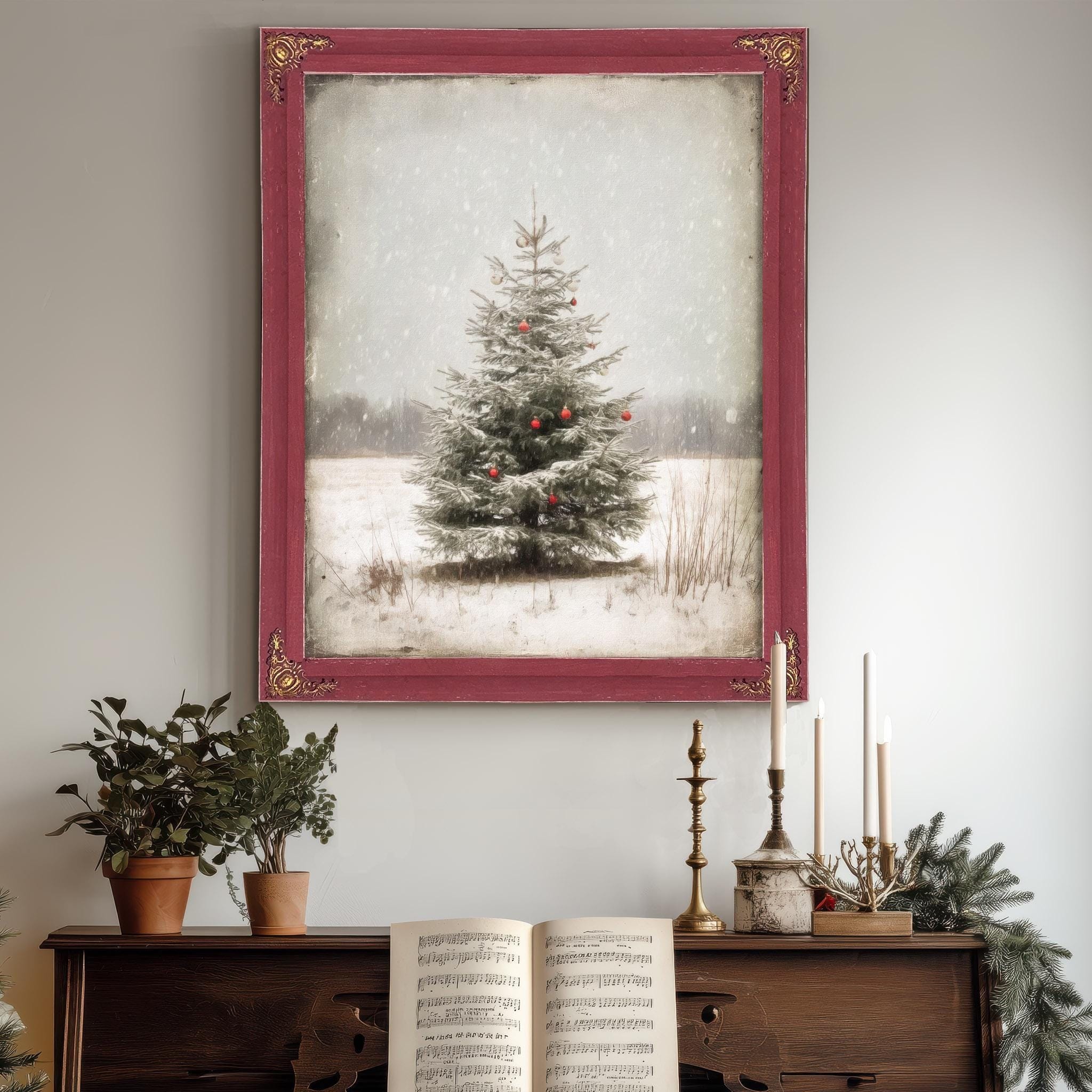• Lone Christmas Tree in Snow – Vintage Winter Wall Art with Red Ornaments – Stretched Canvas or Ornate Frame, Farmhouse Christmas Décor