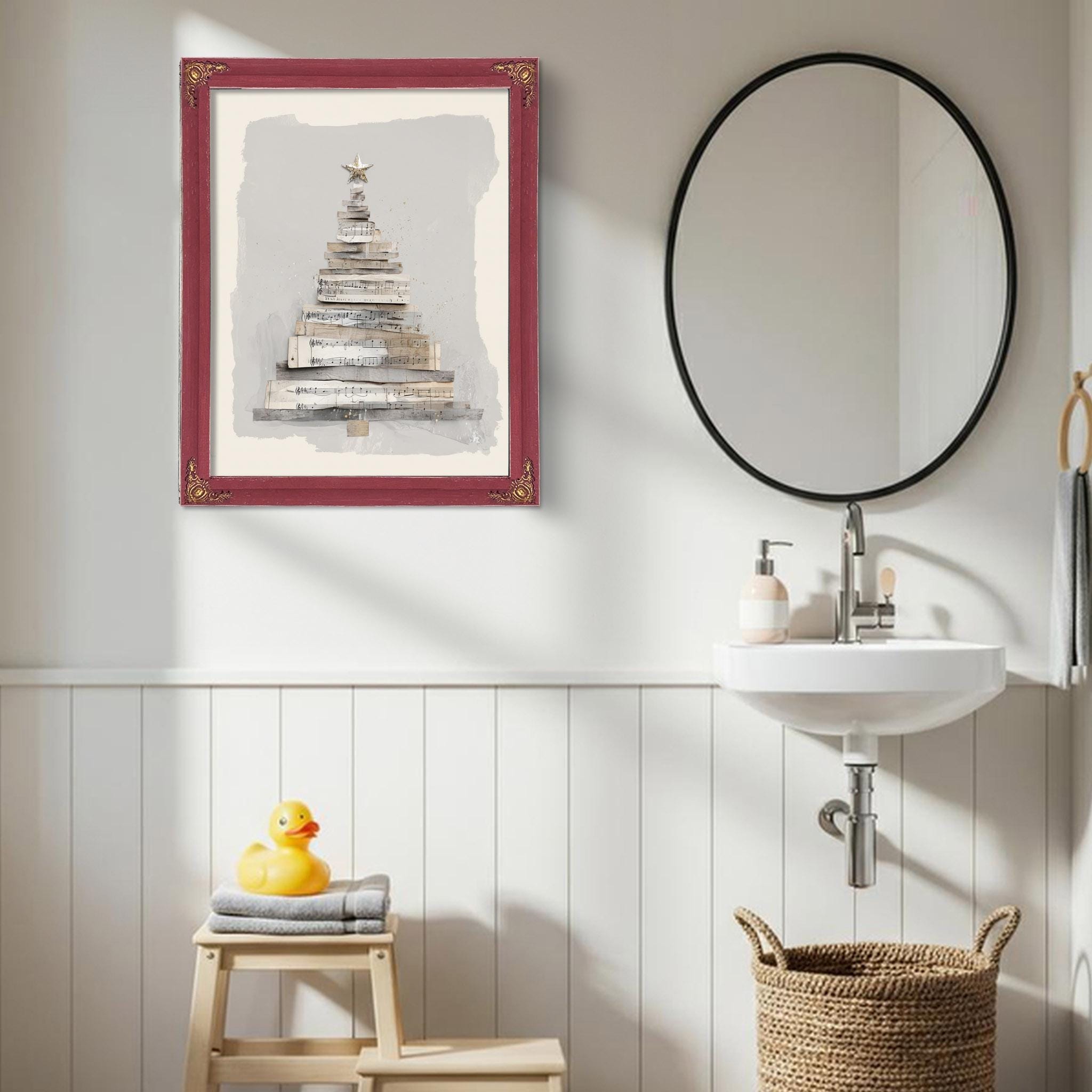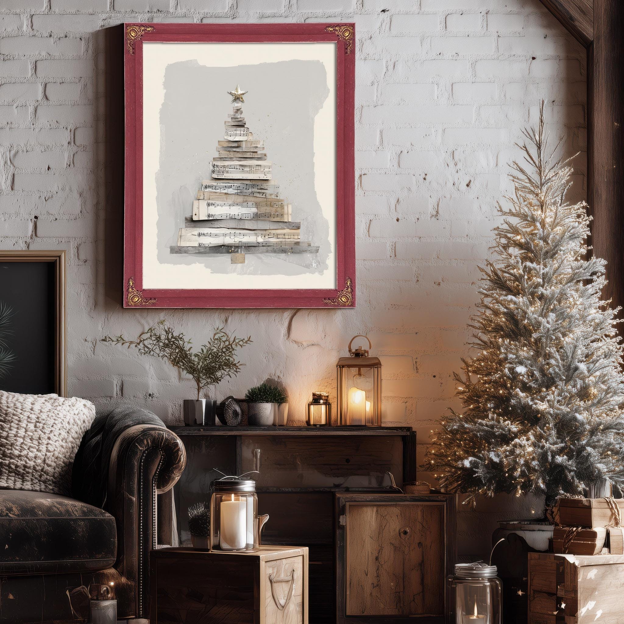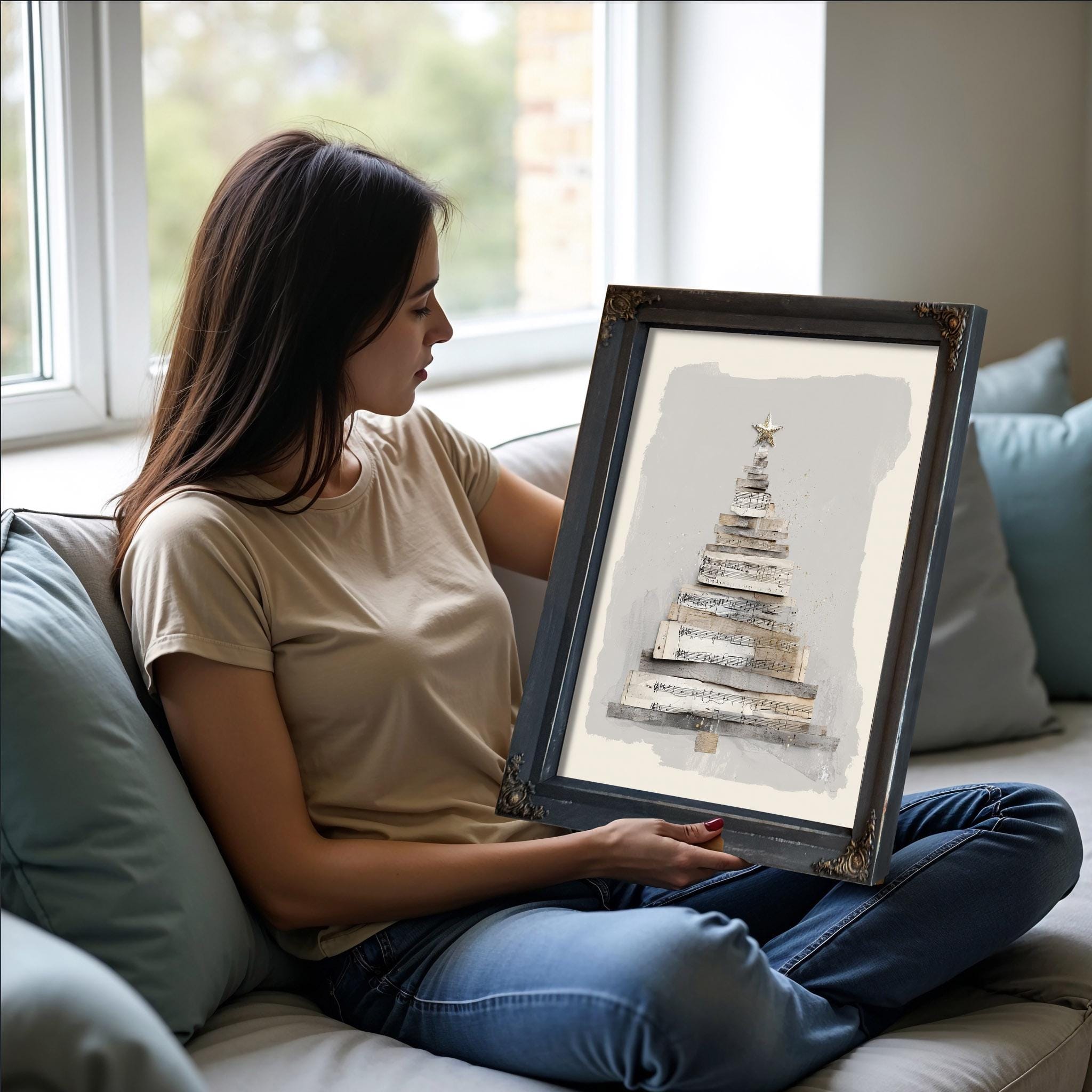 Neutral Sheet Music Christmas Tree – Minimalist Holiday Wall Art – Stretched Canvas or Ornate Frame, Rustic Modern Christmas Décor