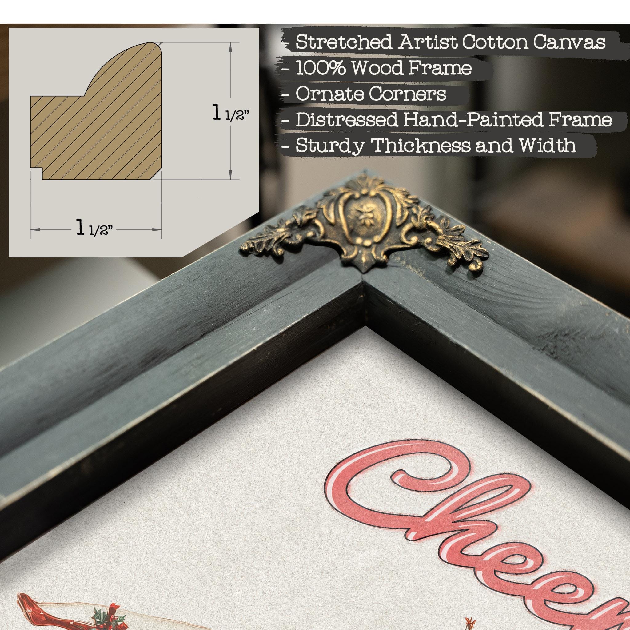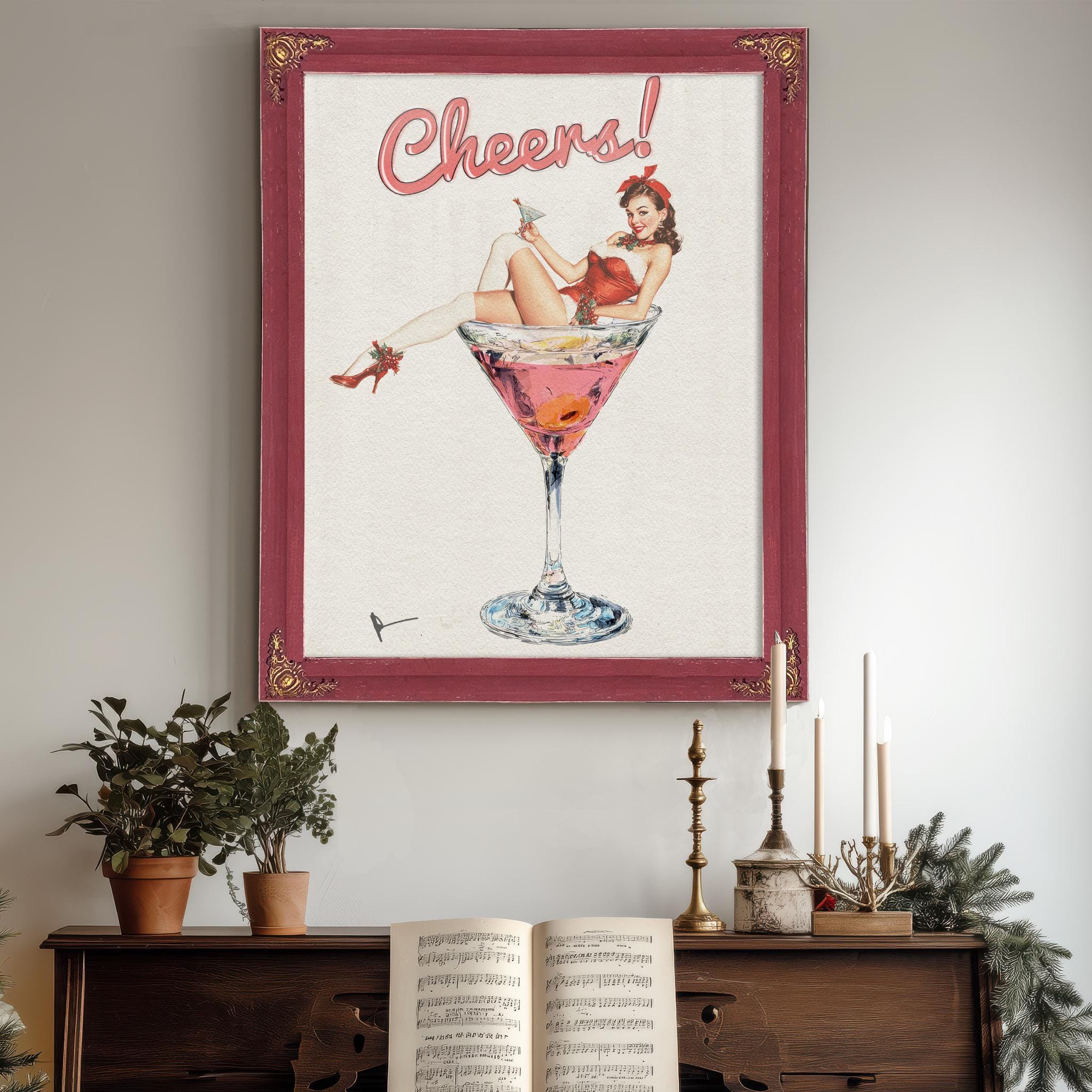 • Retro Pin-Up “Cheers!” Martini Art – Vintage Cocktail Wall Decor – Stretched Canvas or Ornate Rose Frame, Bar & Lounge Artwork