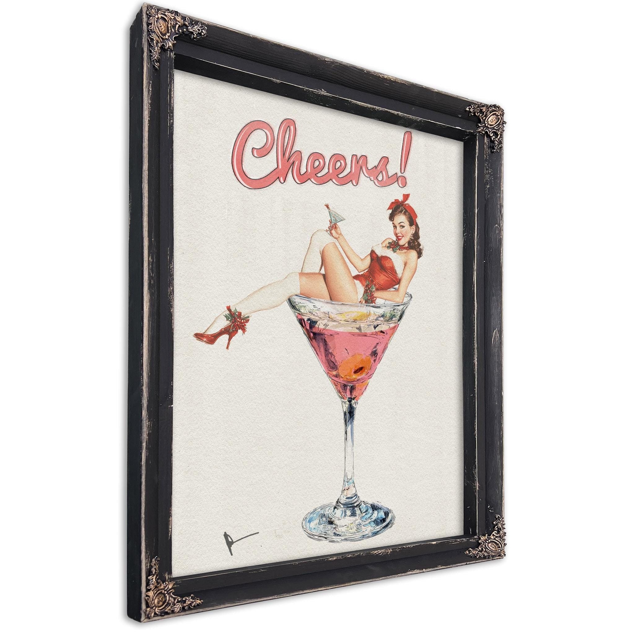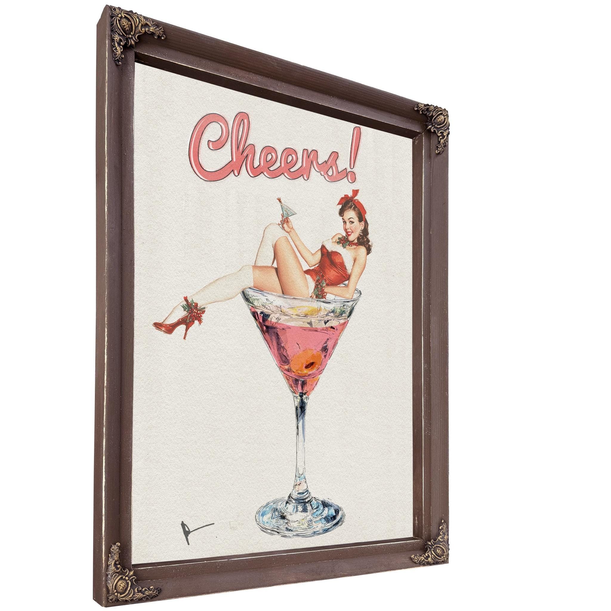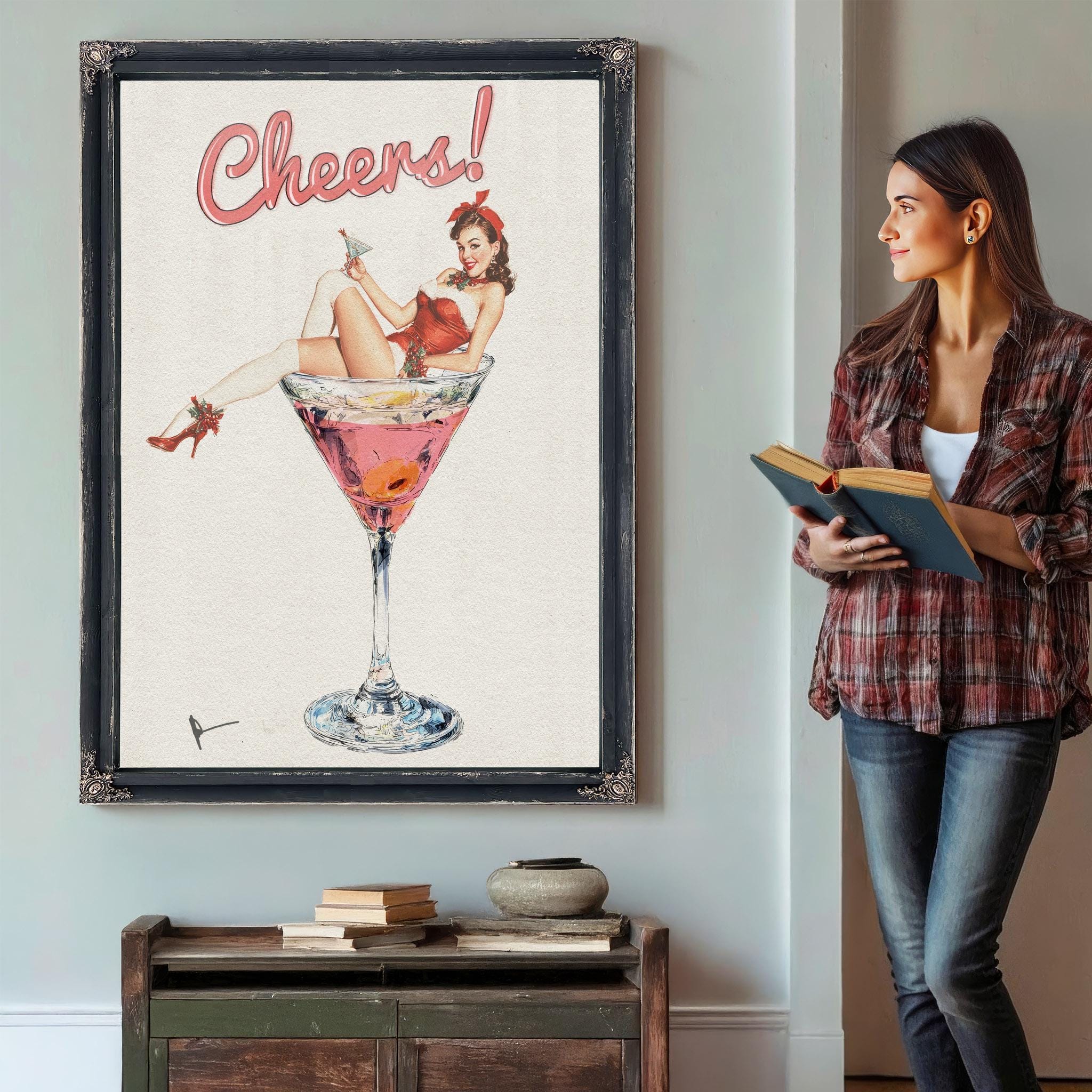 Retro Pin-Up “Cheers!” Martini Art – Vintage Cocktail Wall Decor – Stretched Canvas or Ornate Rose Frame, Bar & Lounge Artwork
