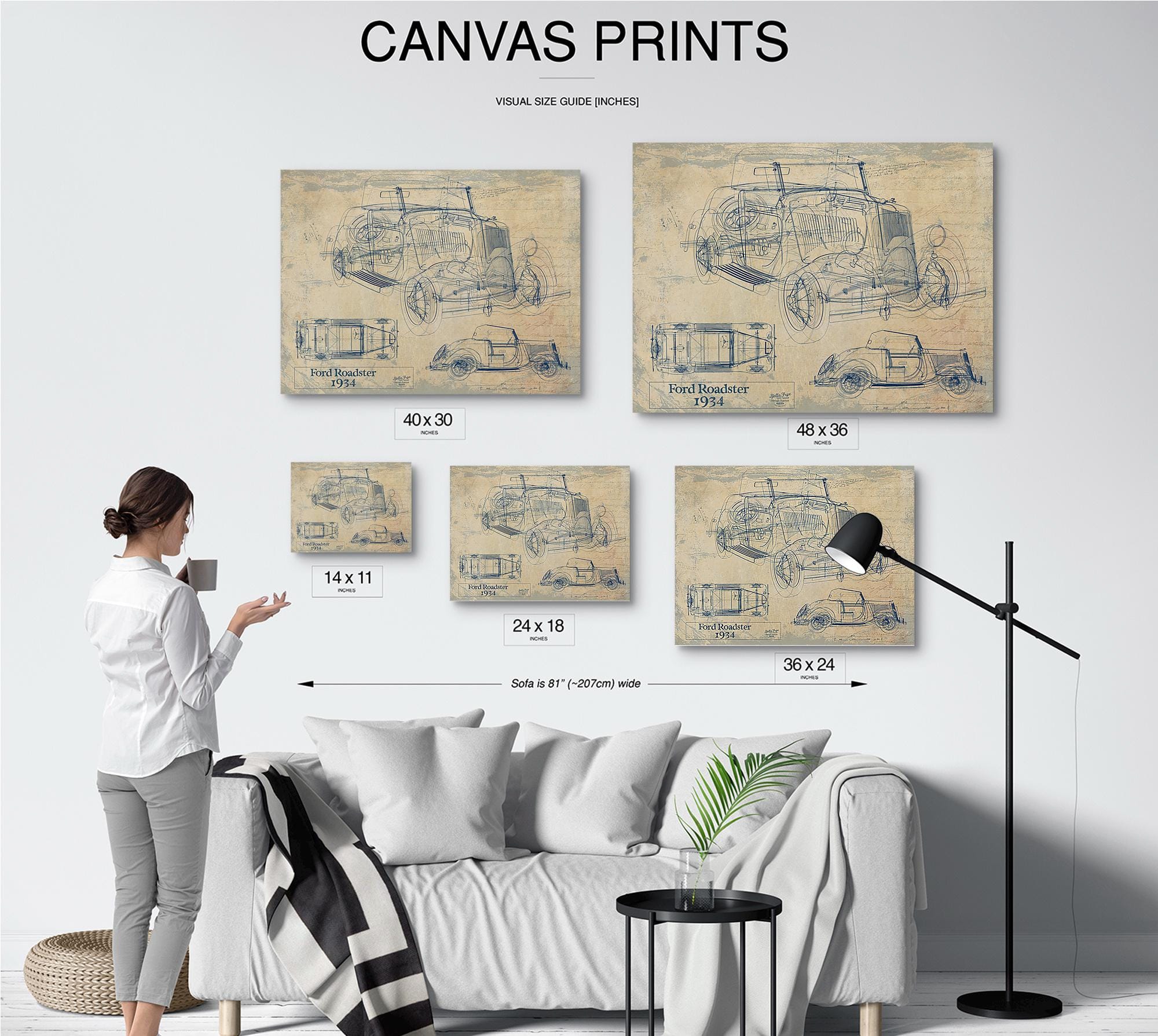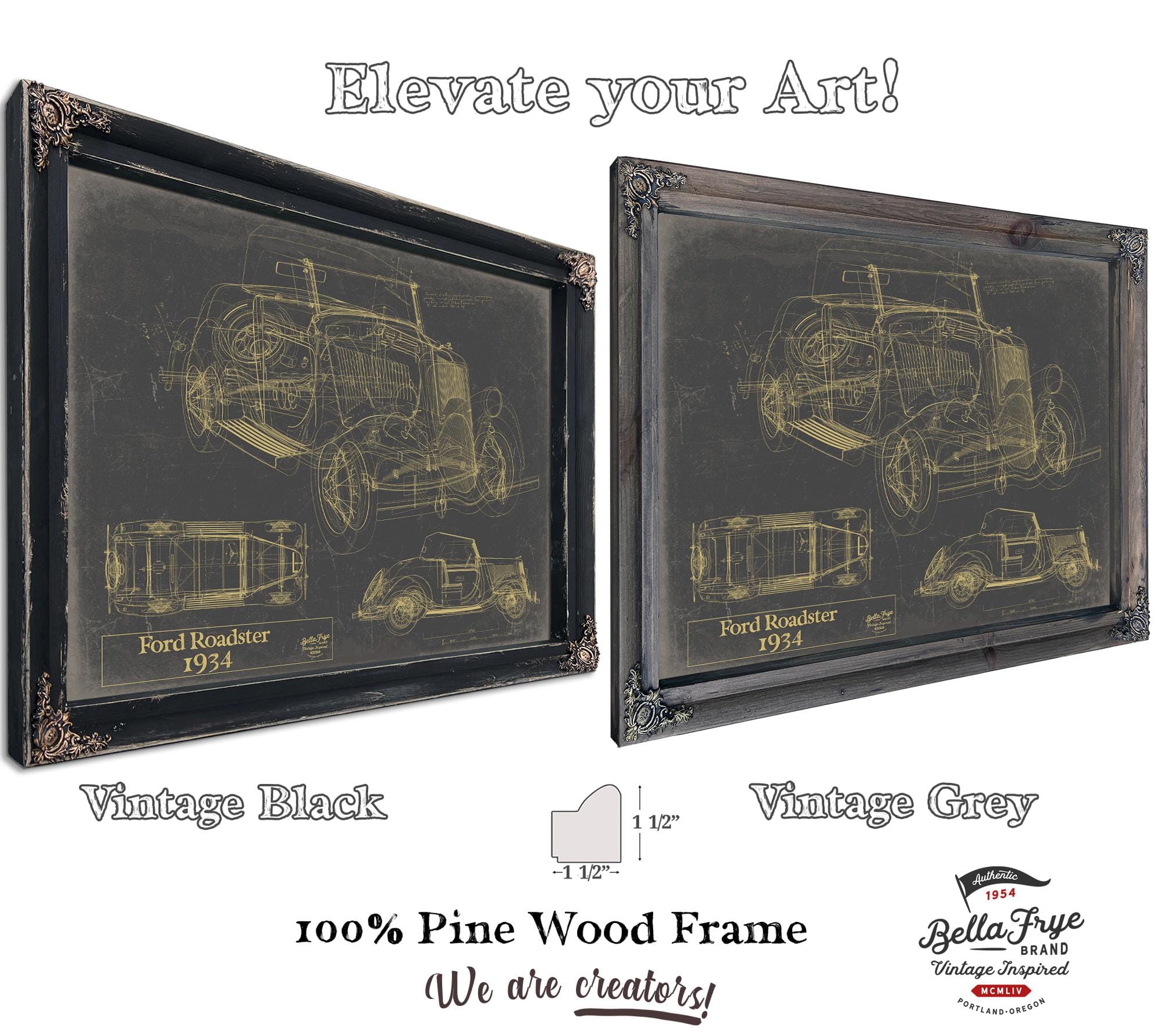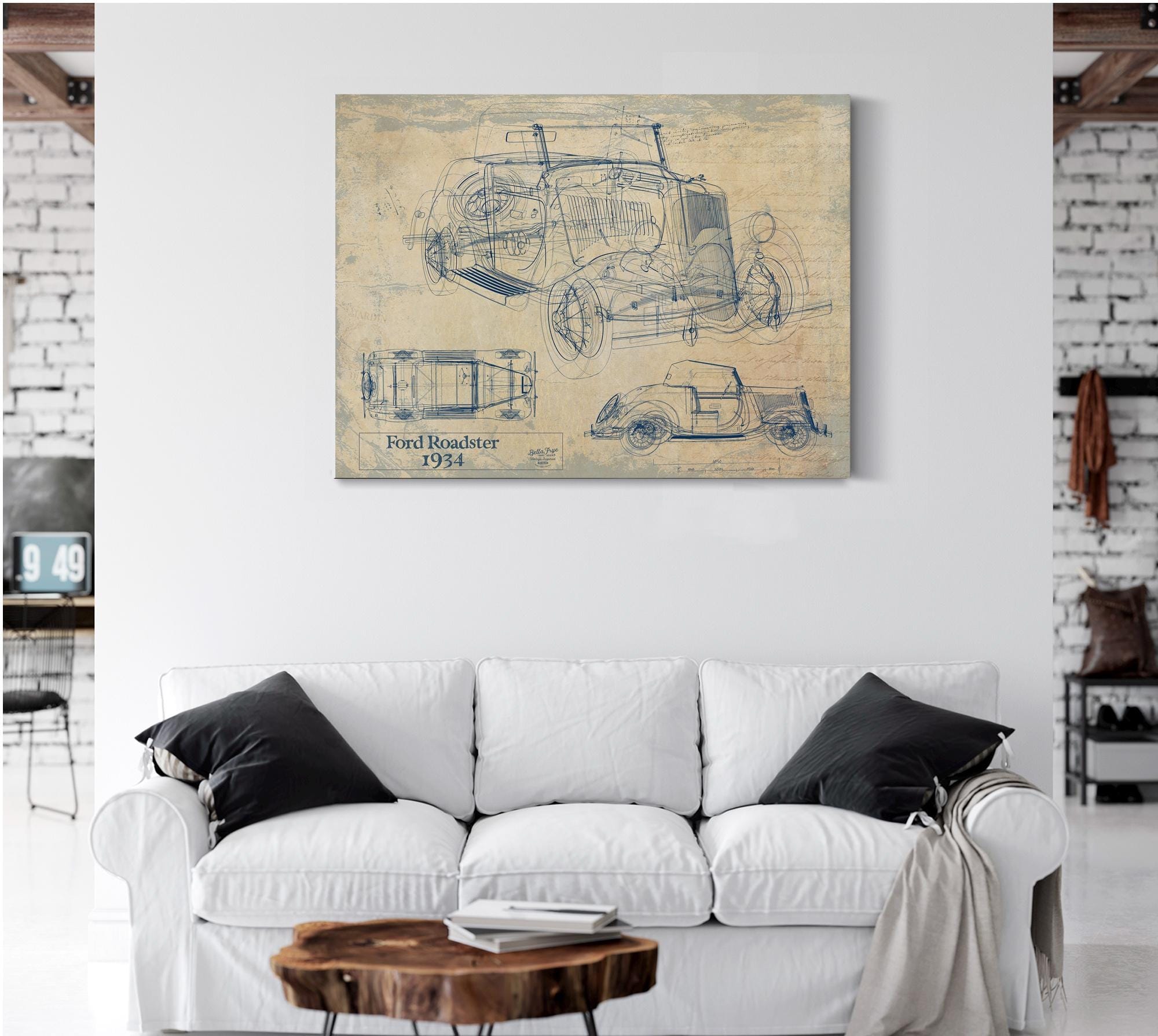 • Bella Frye Vintage 1934 Ford Roadster Model Print,  Original Blueprint Canvas, Framed, or Unframed Art