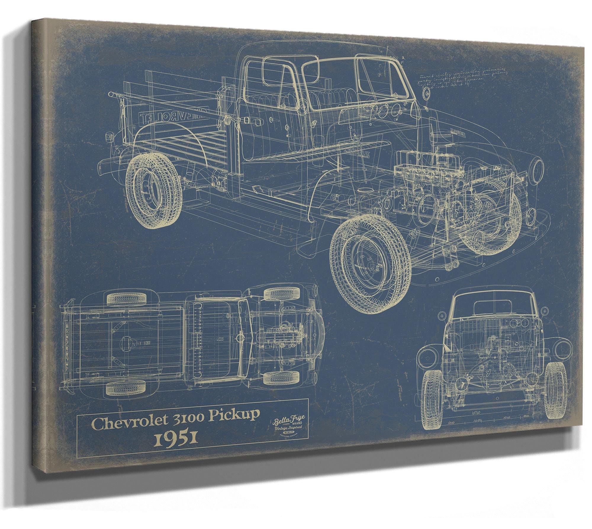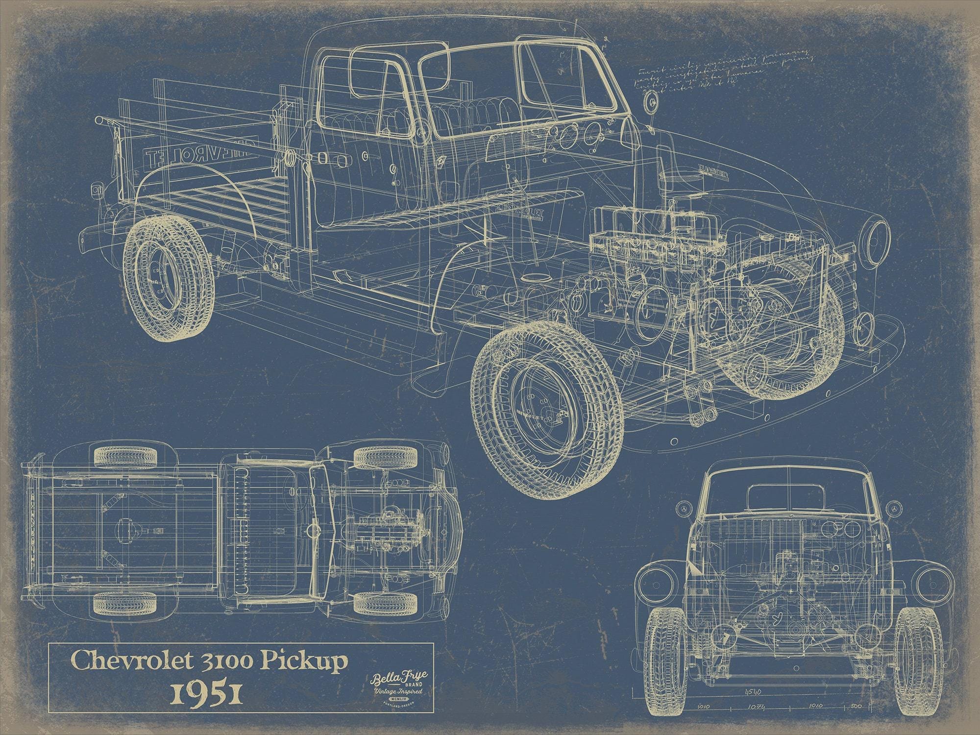 • Bella Frye Vintage 1951 Chevrolet 3100 Pickup Model Mancave Blueprint Art
