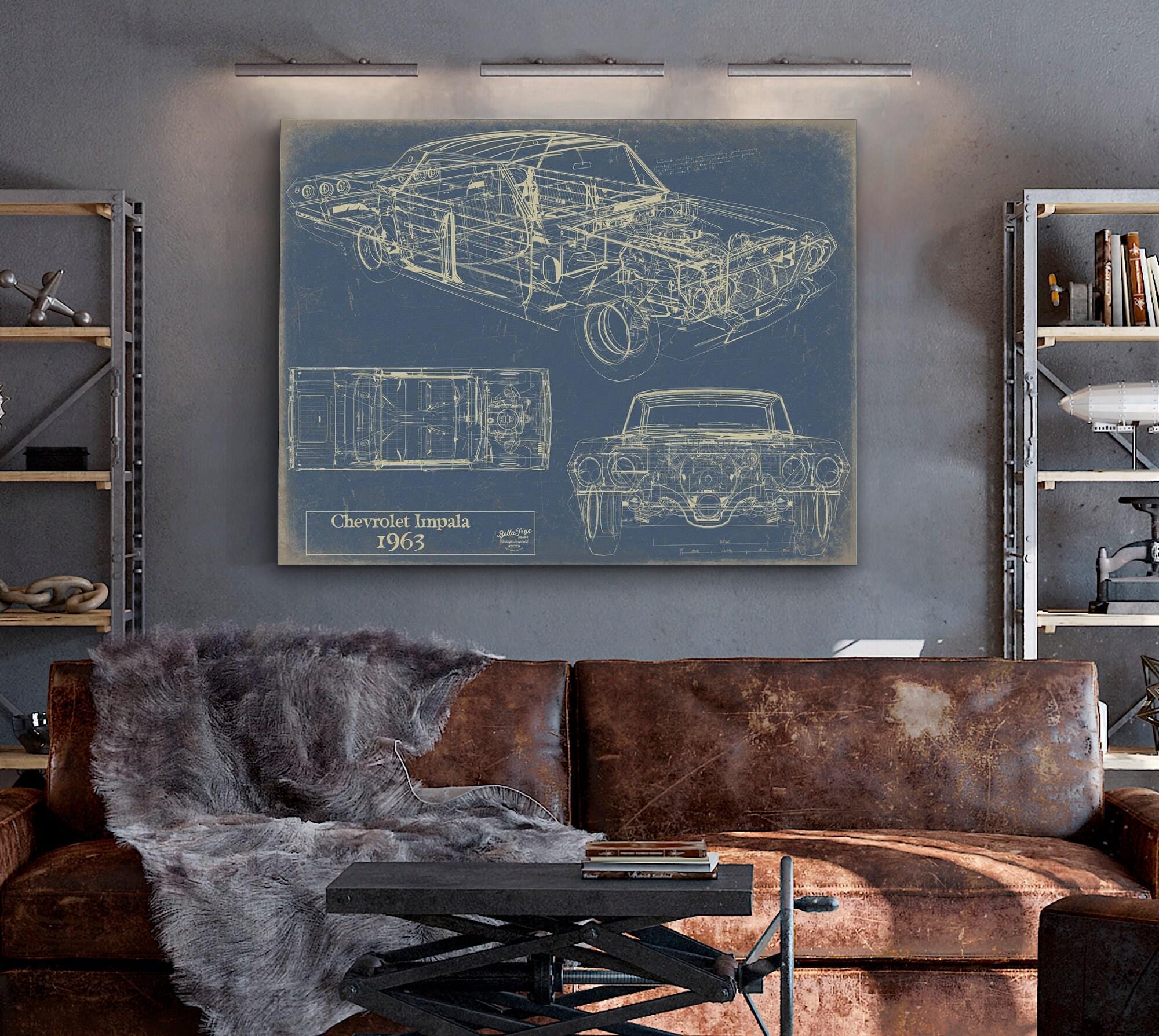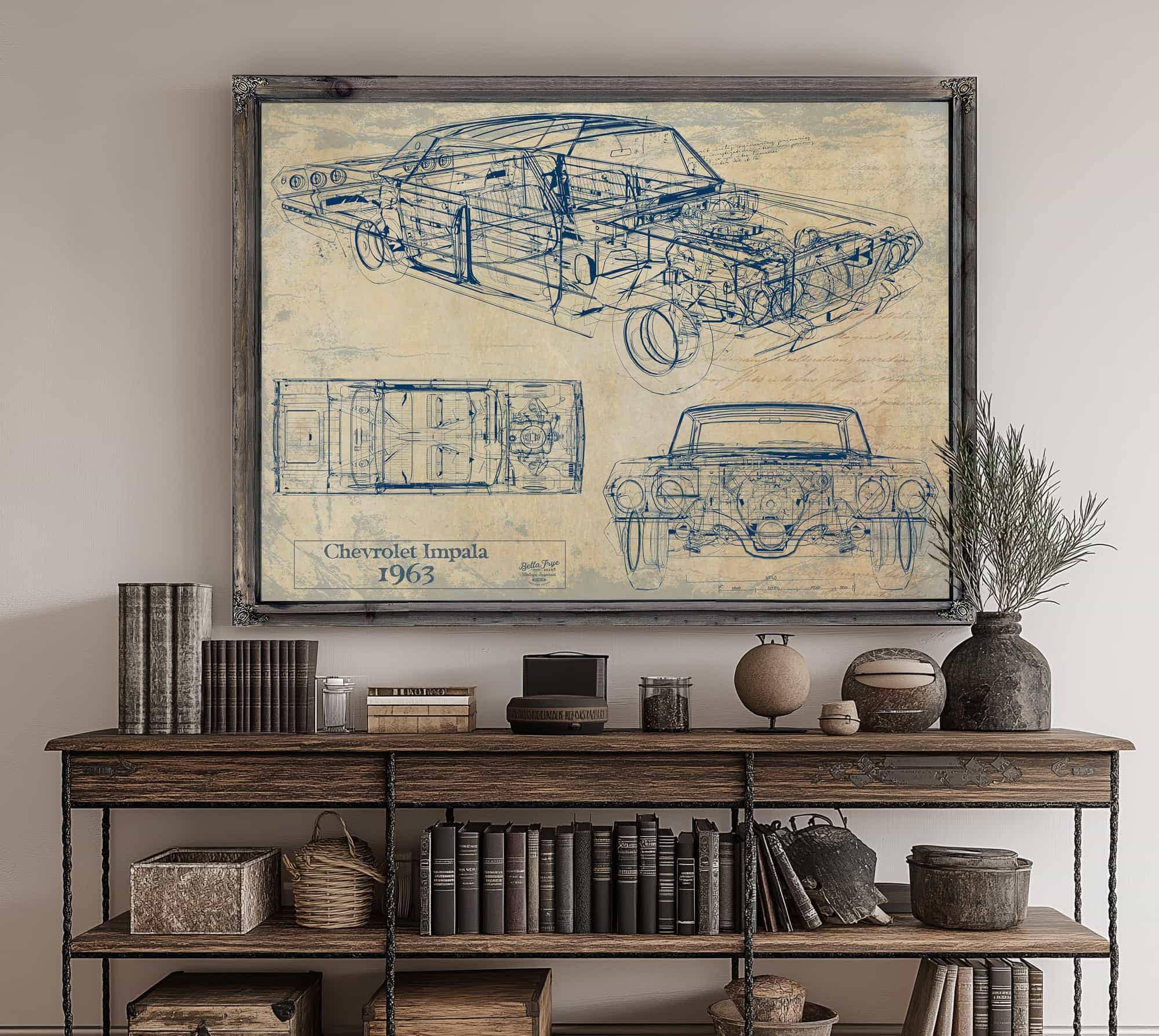 Vintage 1963 Chevrolet Impala Car Model Print, Original Blueprint Canvas, Framed, or Unframed Art