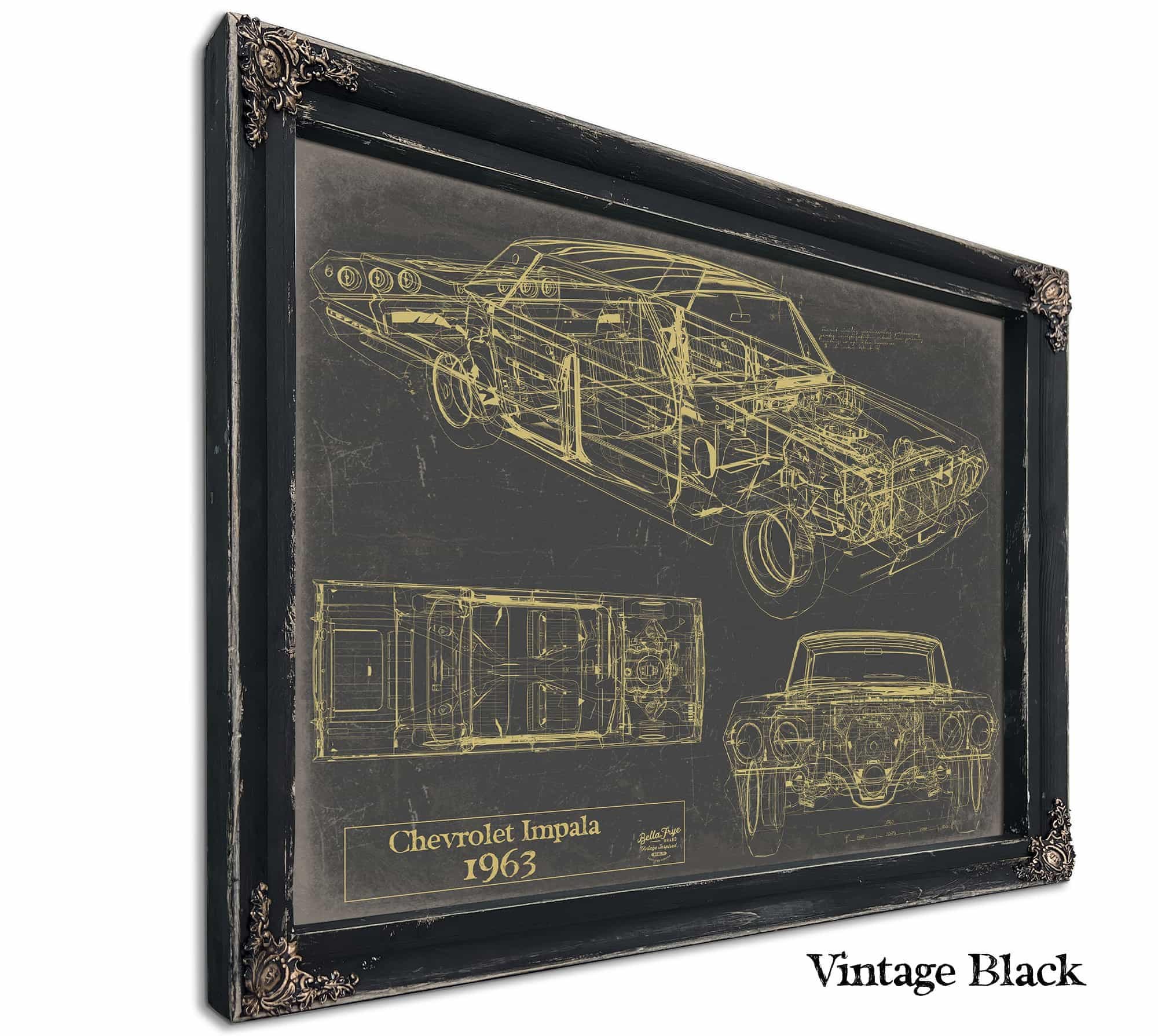 • Bella Frye Vintage 1963 Chevrolet Impala Car Model Print,  Original Blueprint Canvas, Framed, or Unframed Art