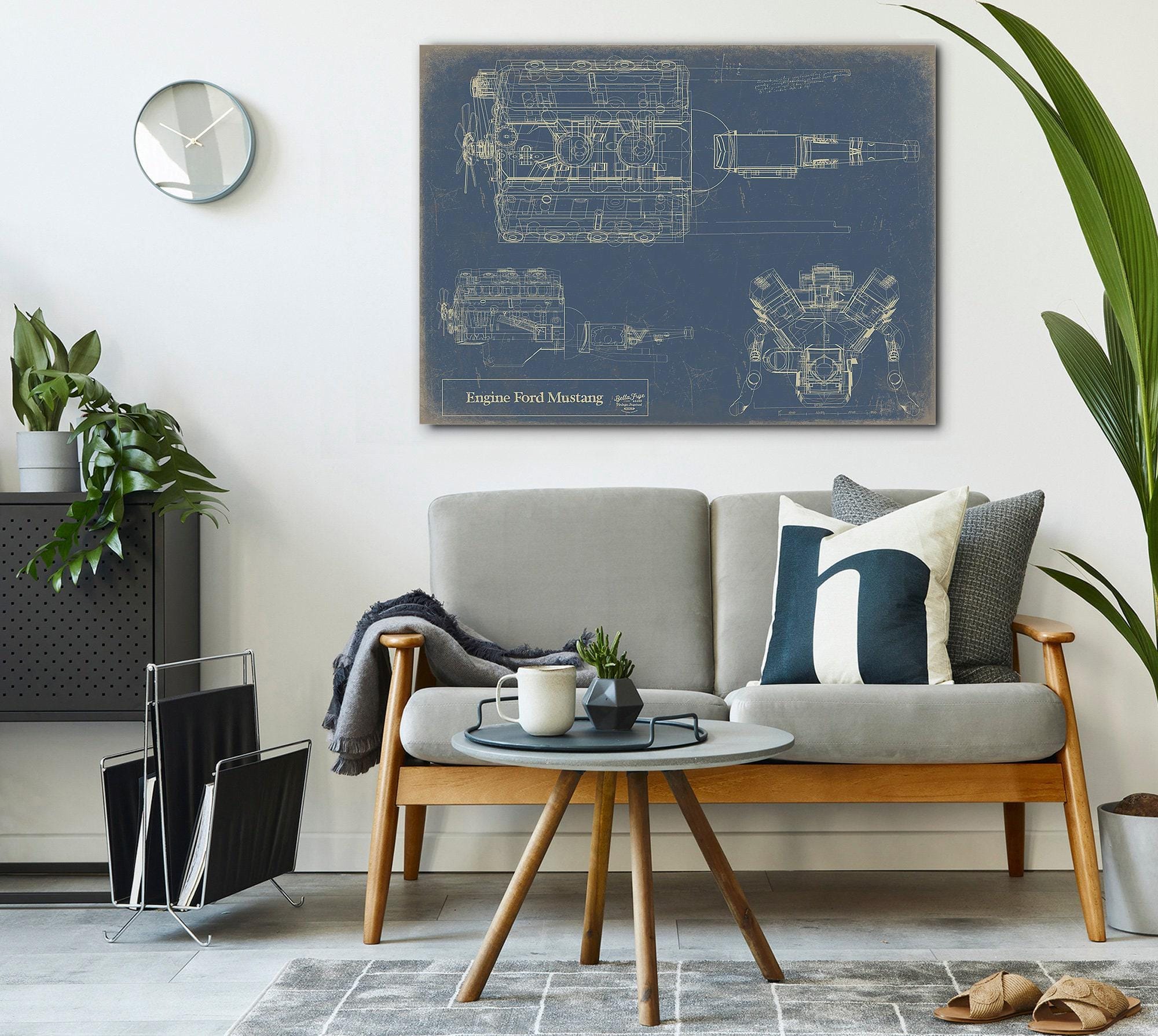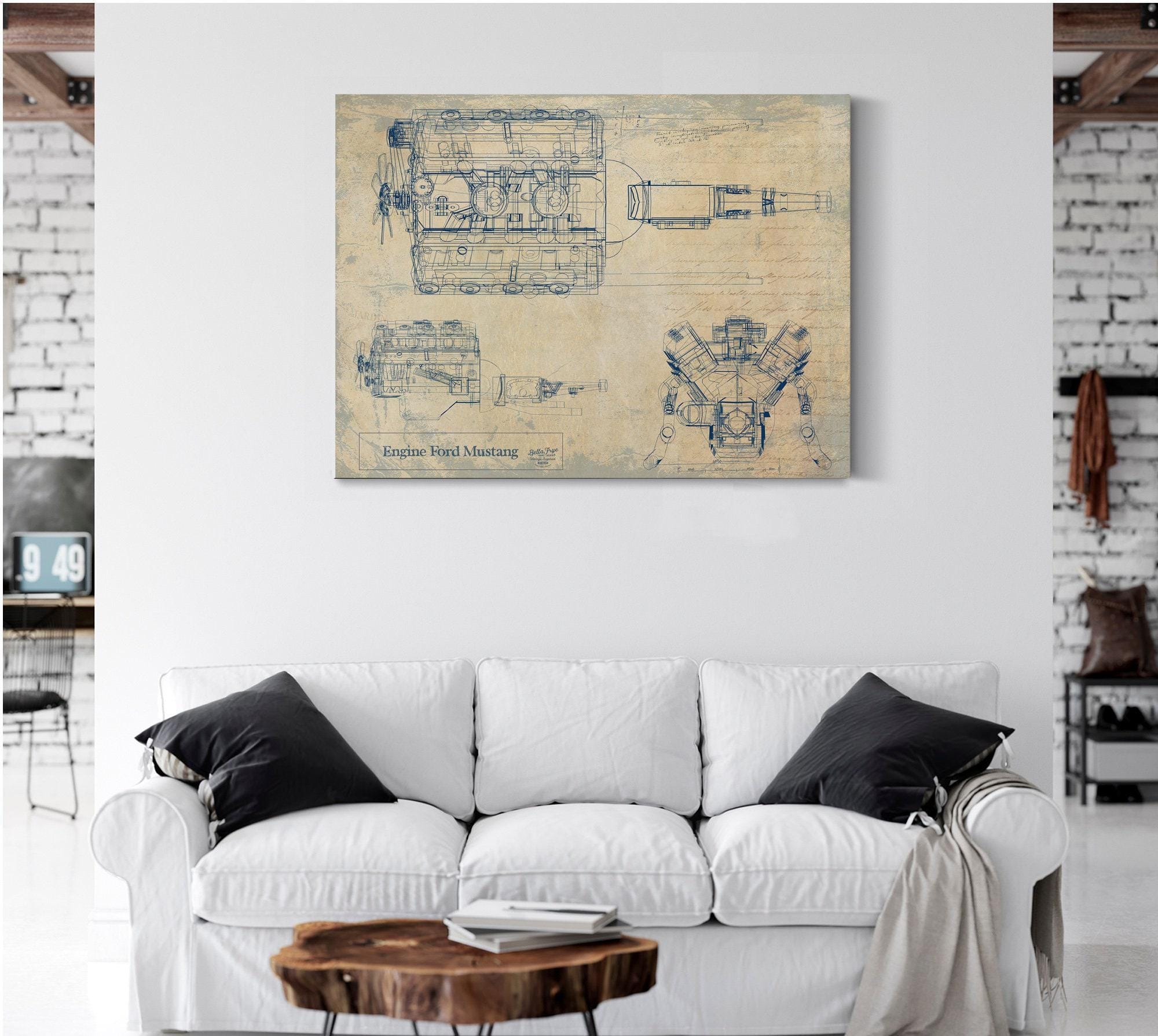 Vintage Engine Ford Mustang Print, Original Blueprint Canvas