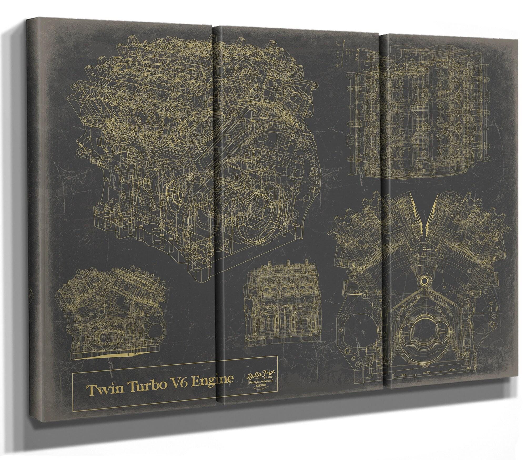 • Bella Frye Vintage Twin Turbo V6 Engine Print,  Original Blueprint Canvas