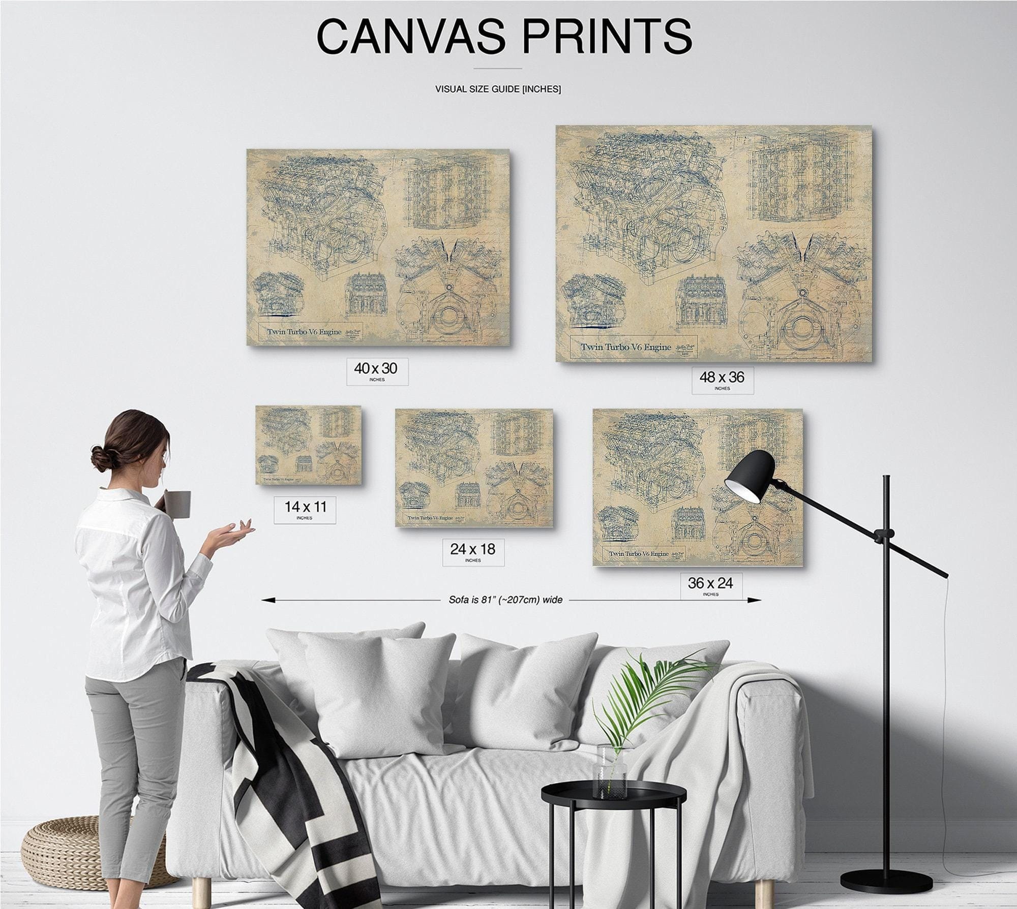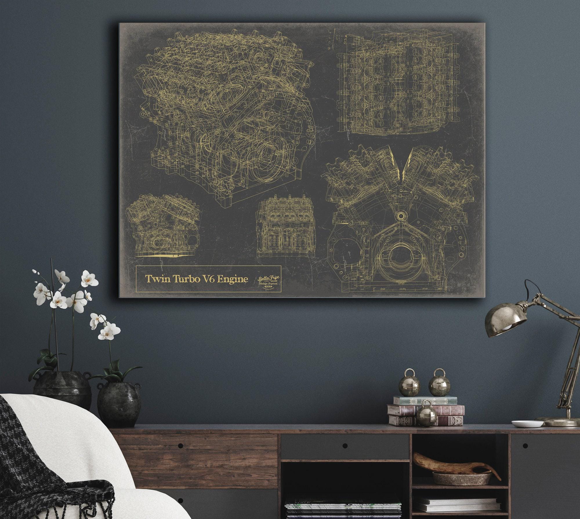 • Vintage Twin Turbo V6 Engine Print,  Original Blueprint Canvas